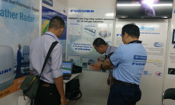 During three days of exhibition, the booth of Haidang Co., Ltd.- the Authorized Distributor and Service Centre of FURUNO in Vietnam has been visited by hundreds of companies and individuals for figuring out and trying demonstrations of Oil Radar, Integrated Oil Spill Detection System and WASSP S3- Multi-beam for survey and mapping seabed. Furthermore, visitors were also interested in new equipment with useful and realistic functions, like Weather Radar, ECDIS